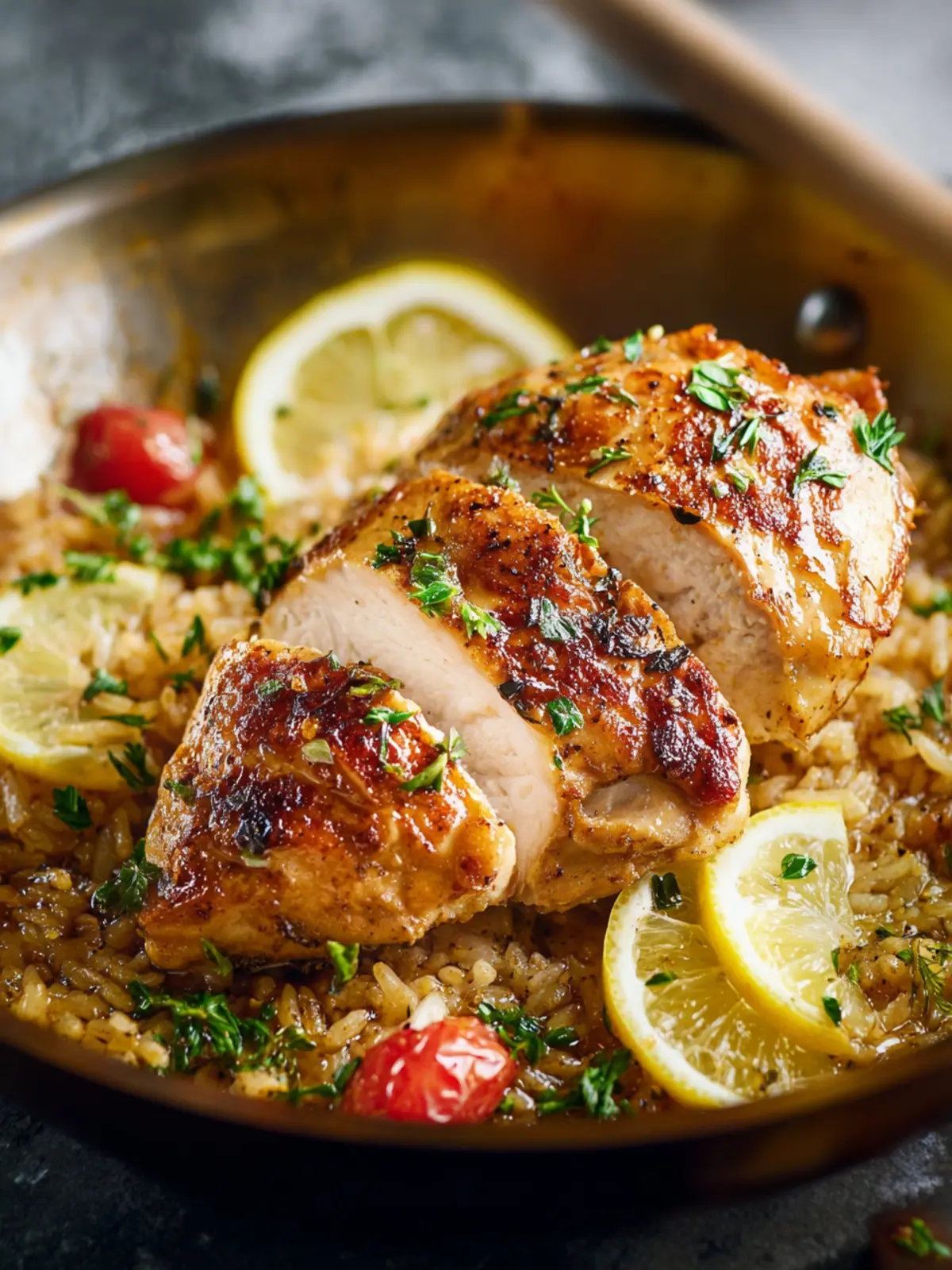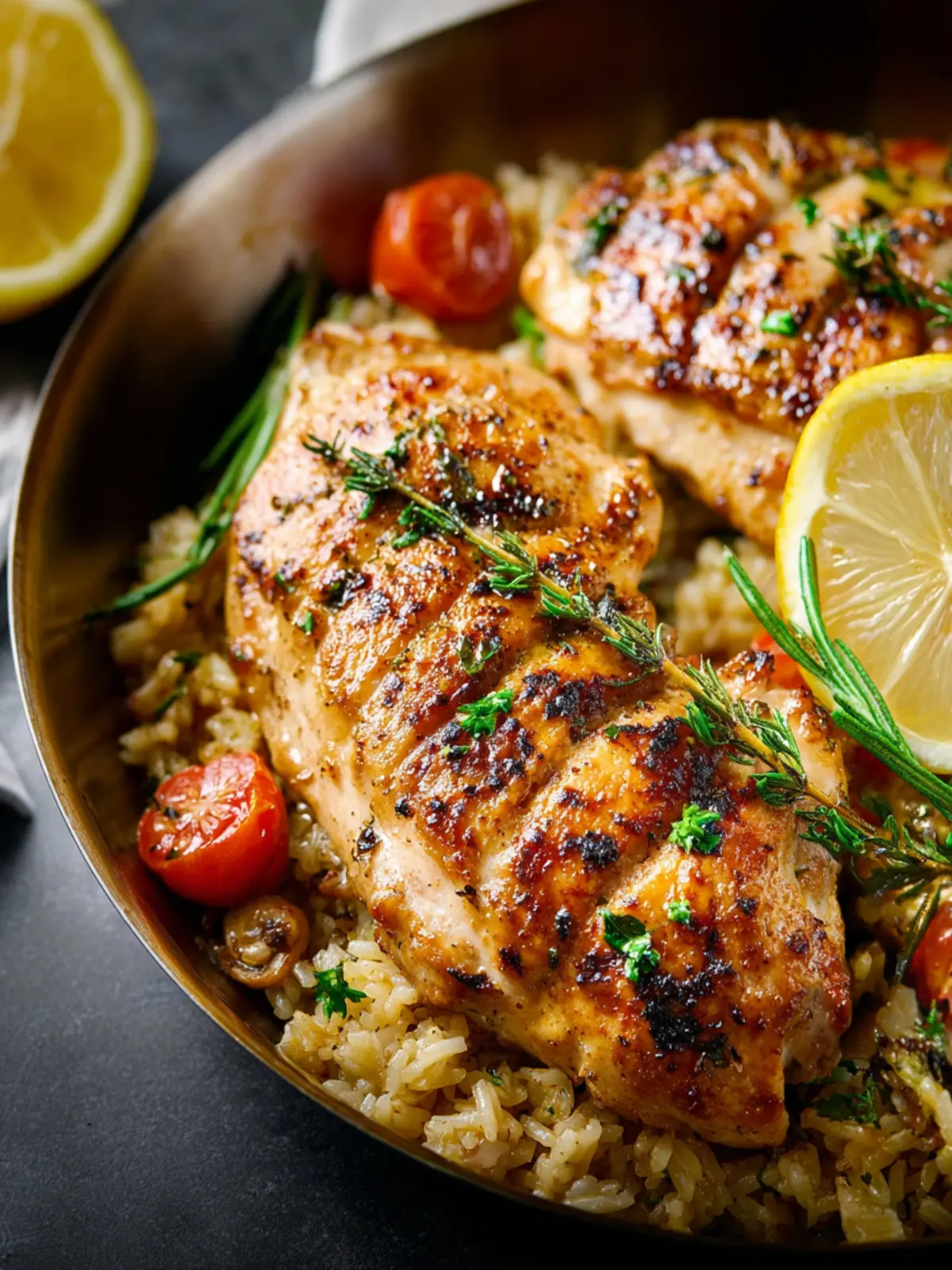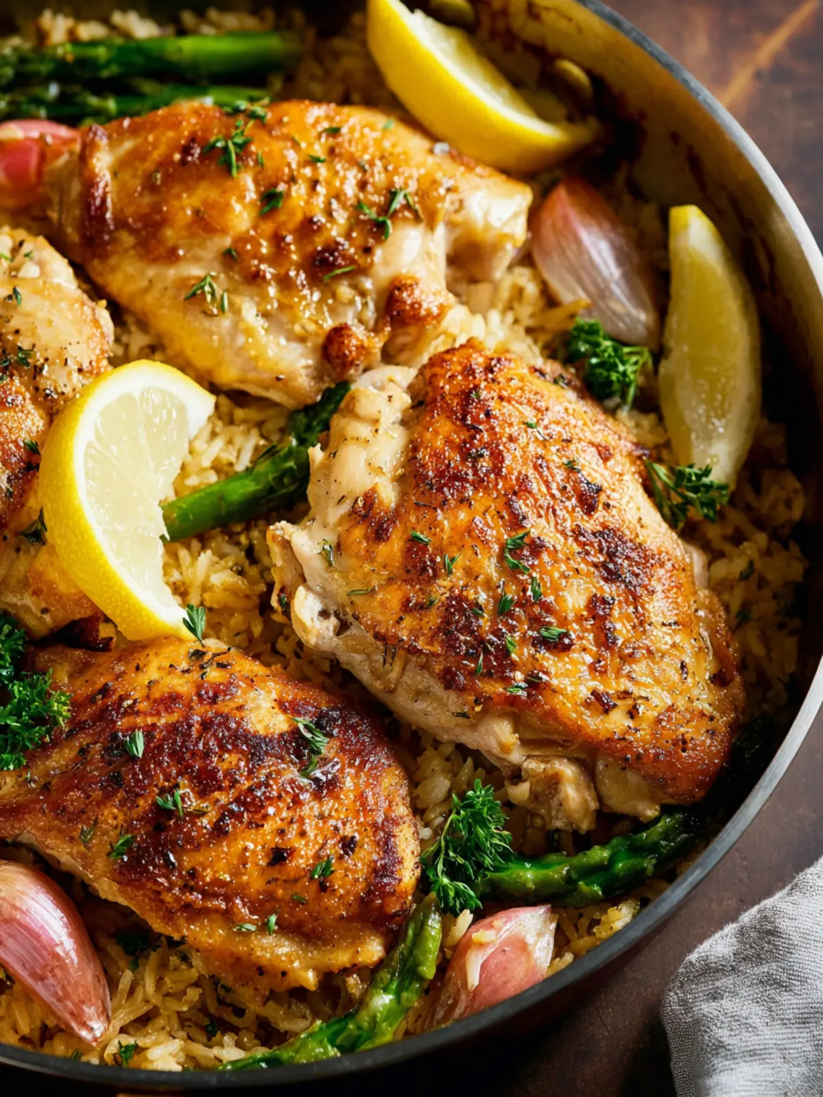 This dish features tender chicken thighs cooked in a flavorful broth with rice, enhanced by a fresh gremolata topping.