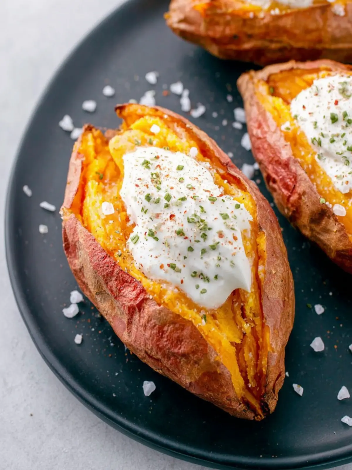 Nutritional Benefits: Packed with vitamins A and C, fiber, and antioxidants, baked sweet potatoes can boost your immune system and promote gut health. One medium sweet potato has about 4 grams of fiber and is very low in calories, making it great for weight management.