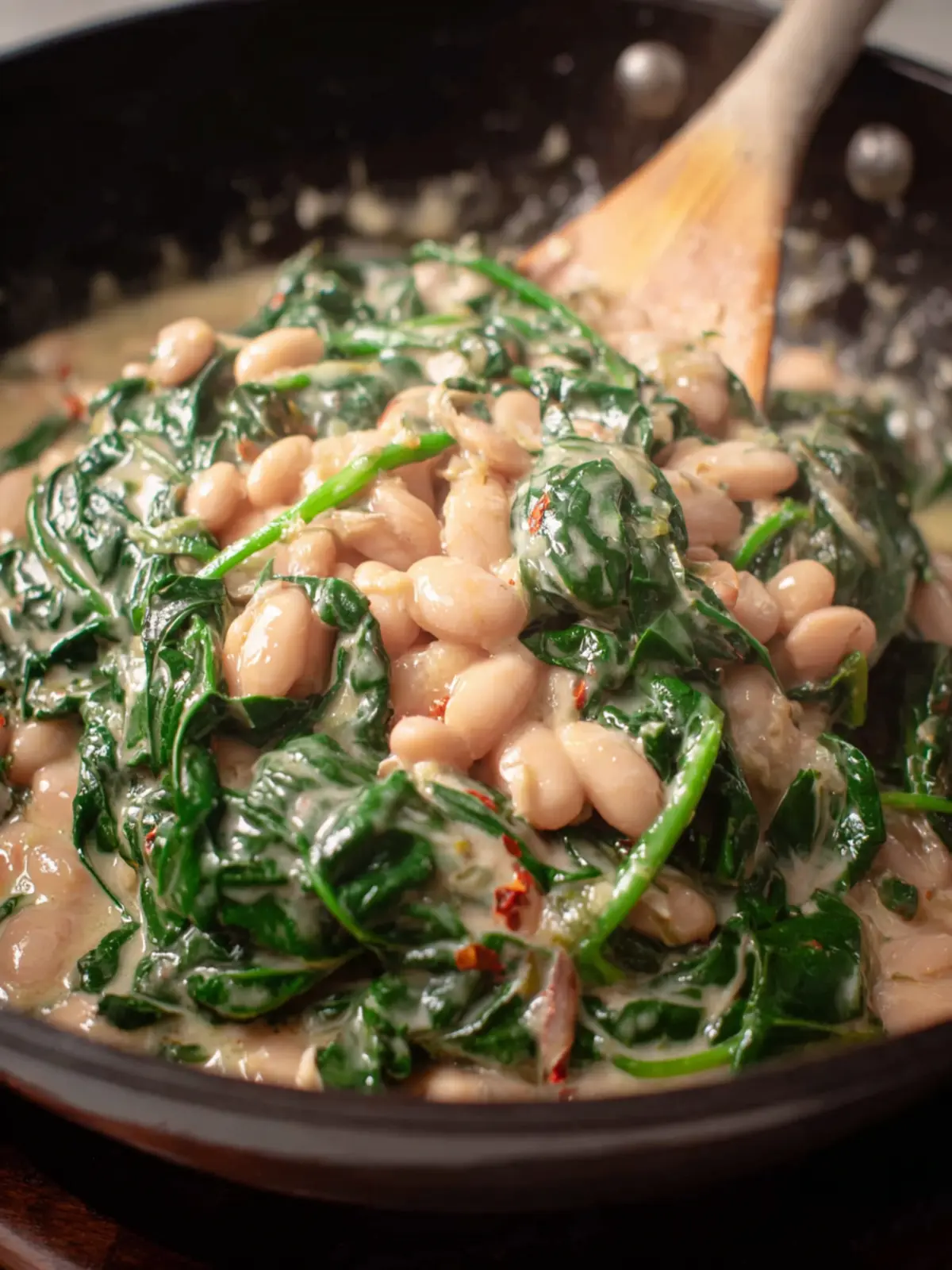 A delicious and creamy white bean spinach dish that’s perfect as a main or side.