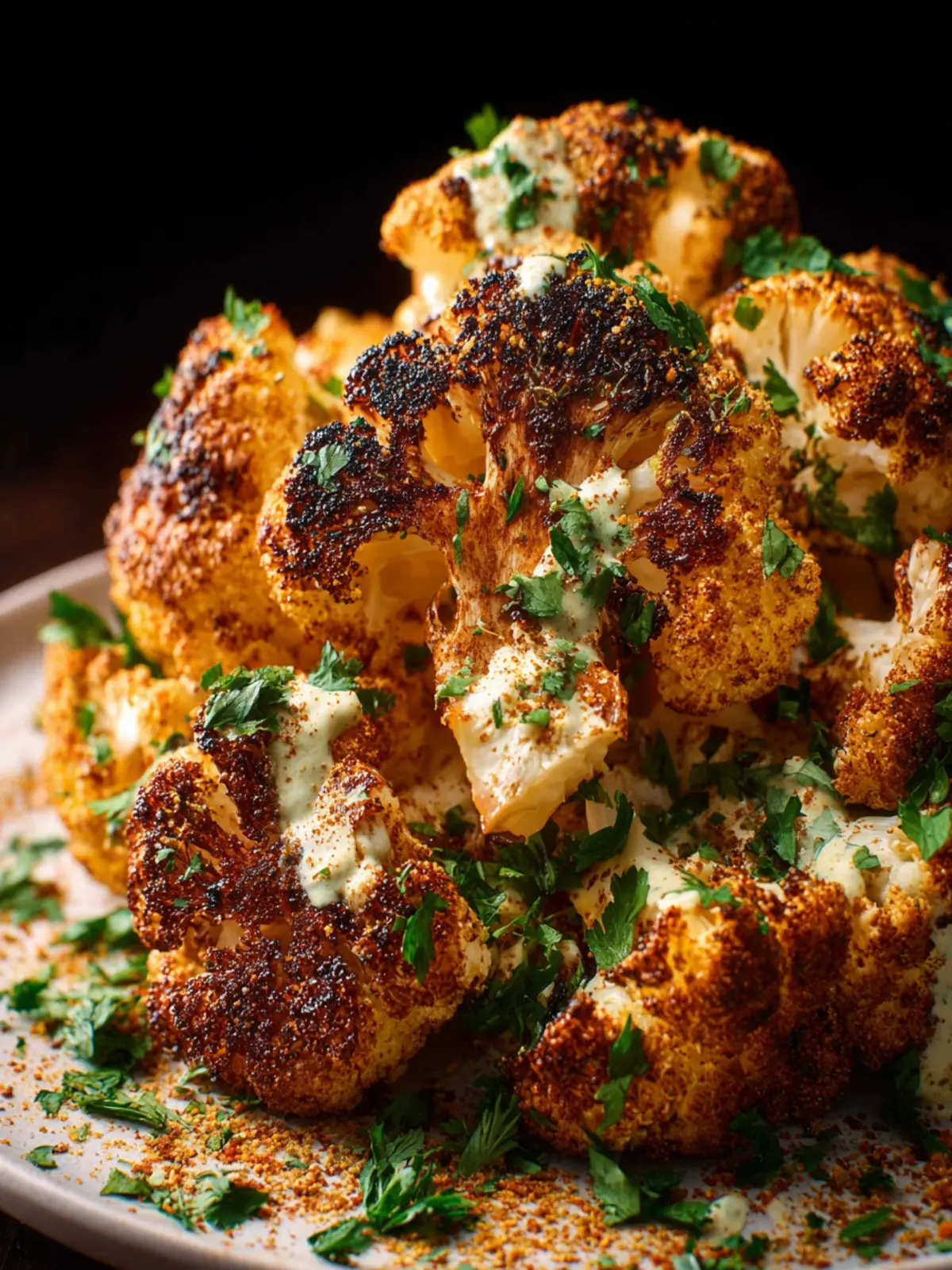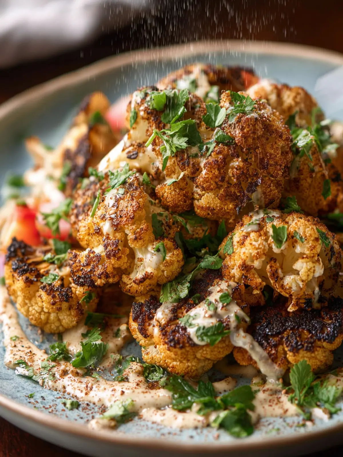 A delicious roasted cauliflower recipe served with a flavorful tahini sauce and fresh herbs.