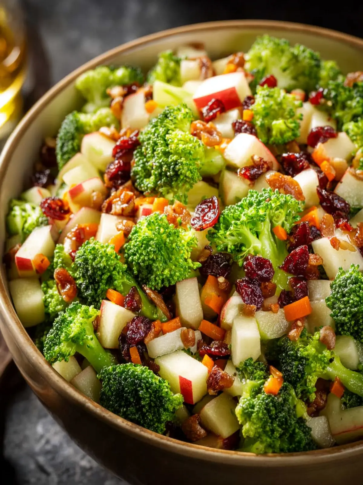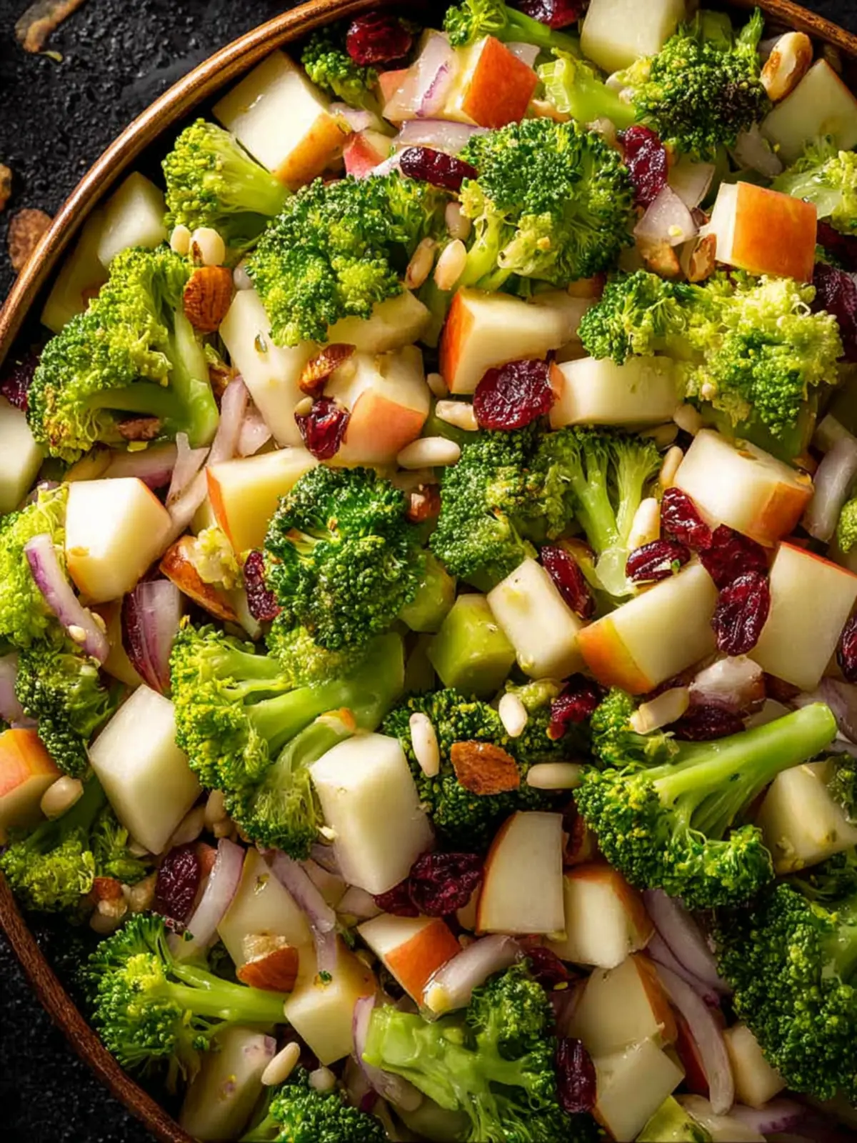 Refreshing salad featuring blanched broccoli, crisp apples, and sweet cranberries, dressed in a tangy vinaigrette.