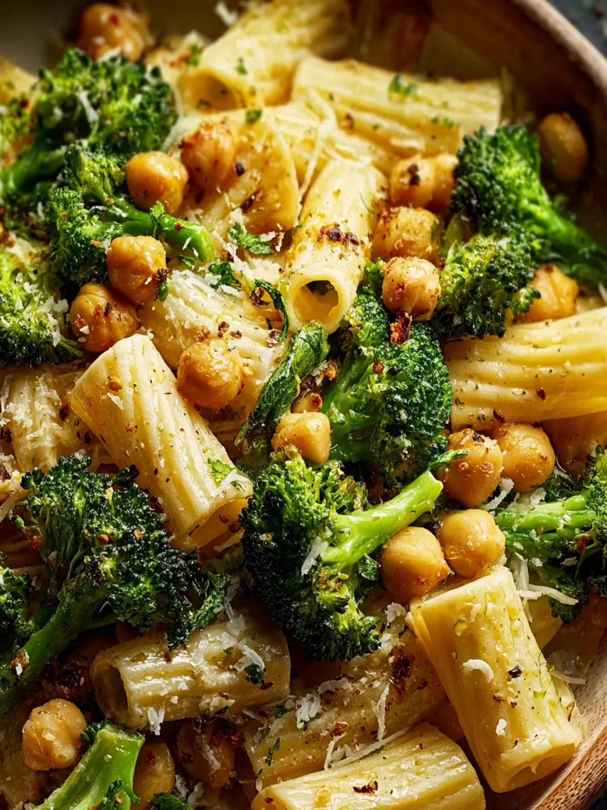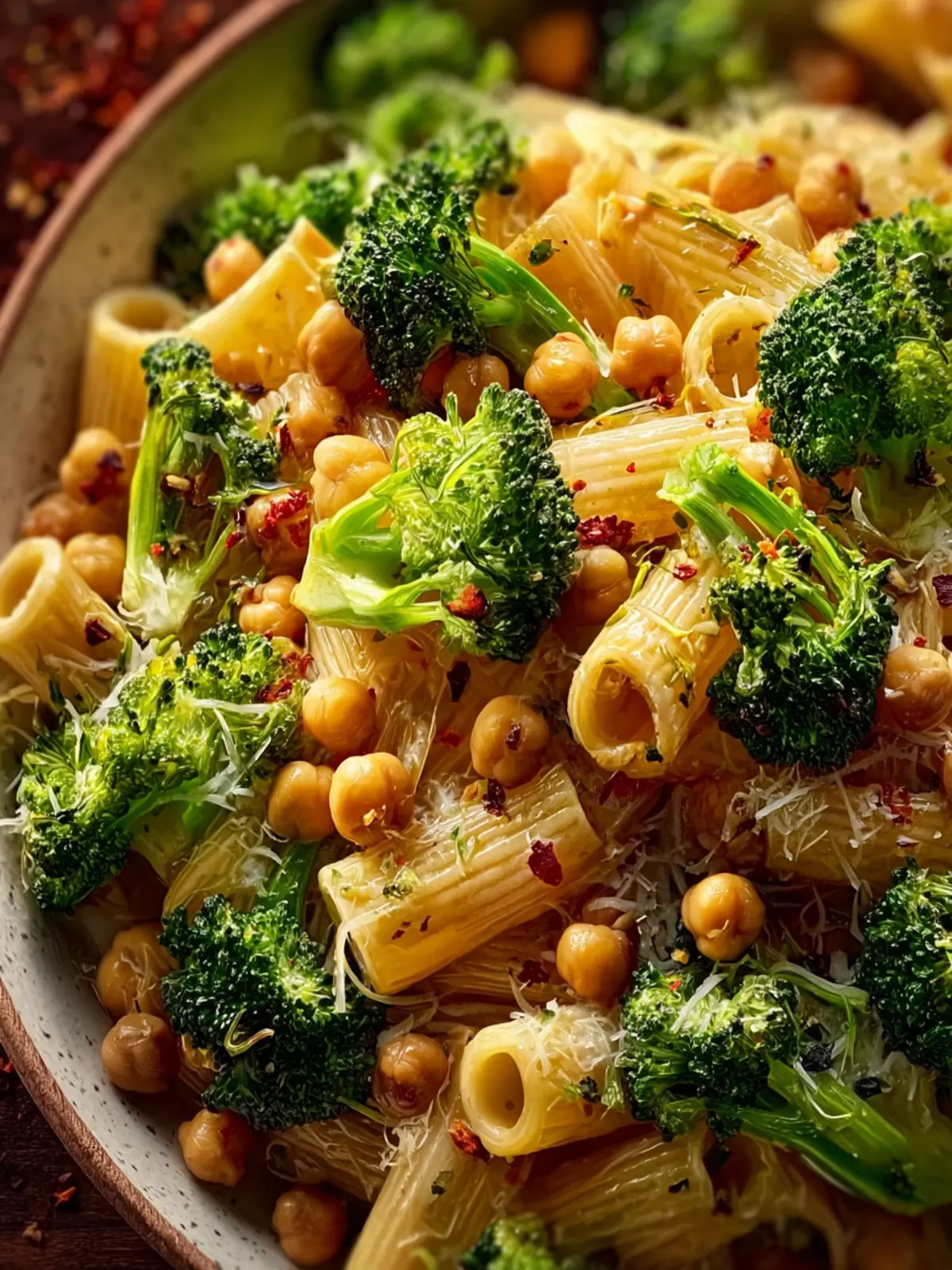 A comforting Mediterranean-inspired pasta dish featuring broccoli and chickpeas, all wrapped in a delicious garlic olive oil sauce.