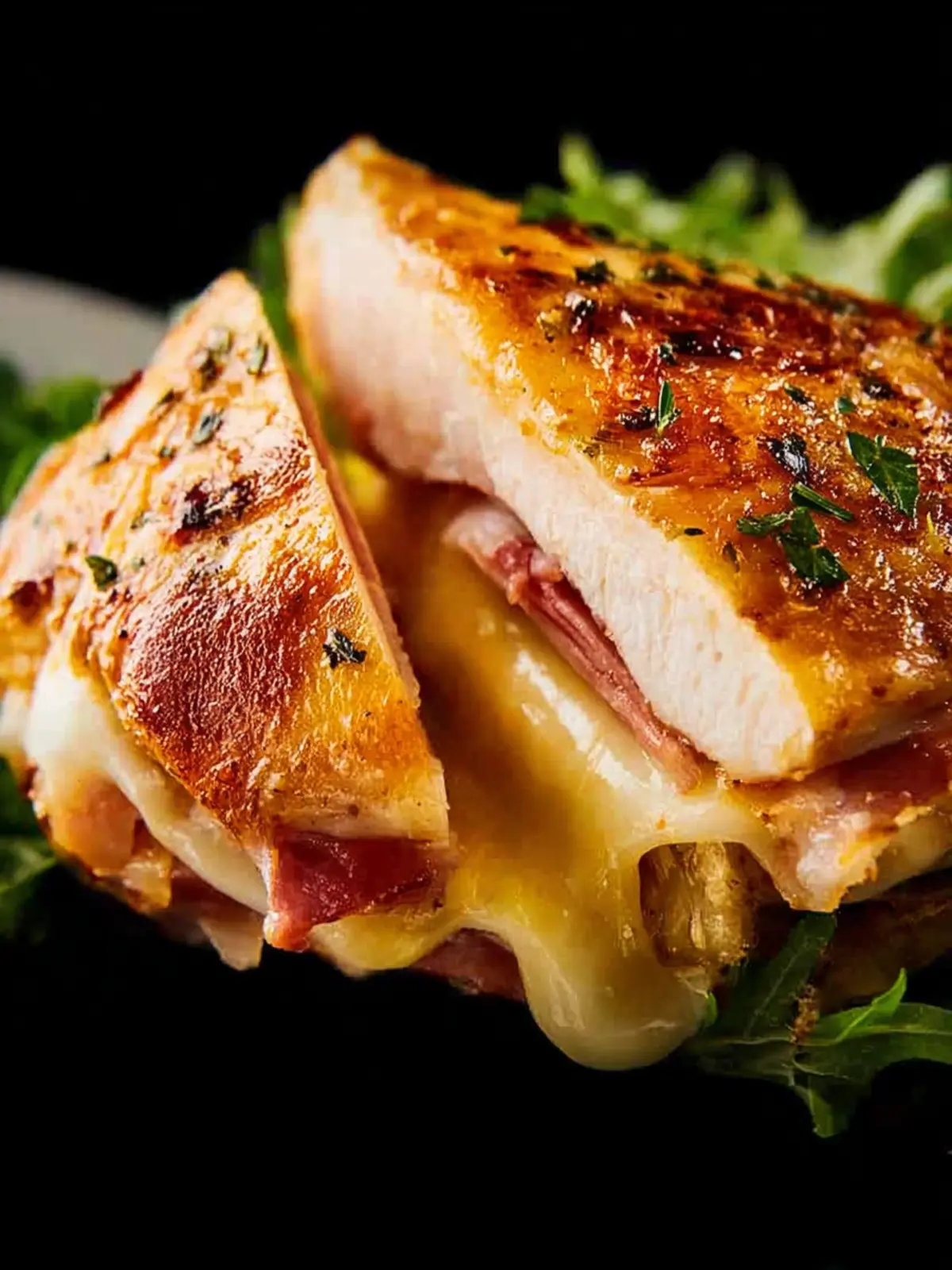 Delicious stuffed chicken breasts filled with ham and cheese, cooked in a savory garlic sauce.