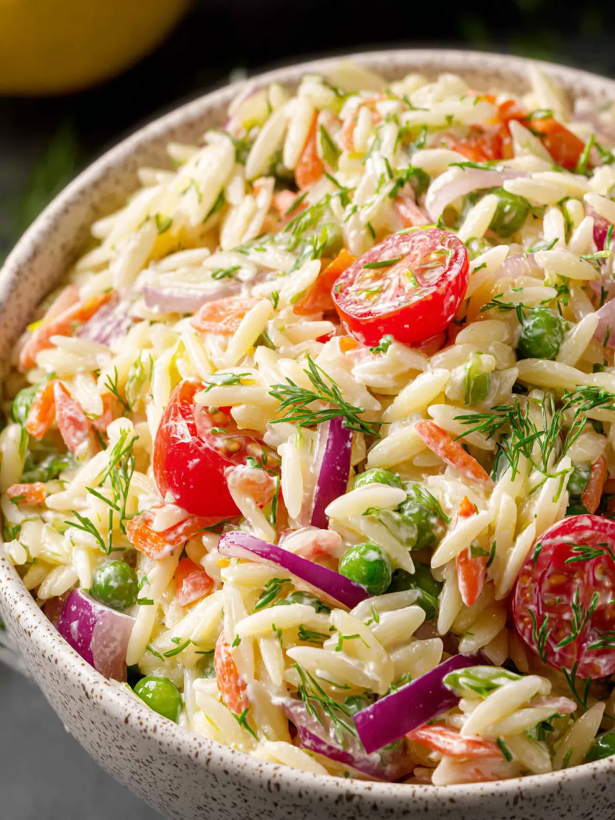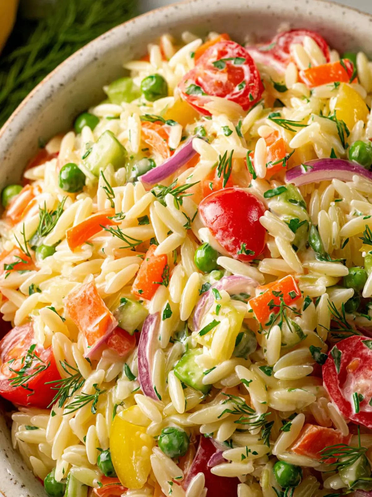 A refreshing orzo salad with peas, tomatoes, cucumbers, and a creamy yogurt dressing.