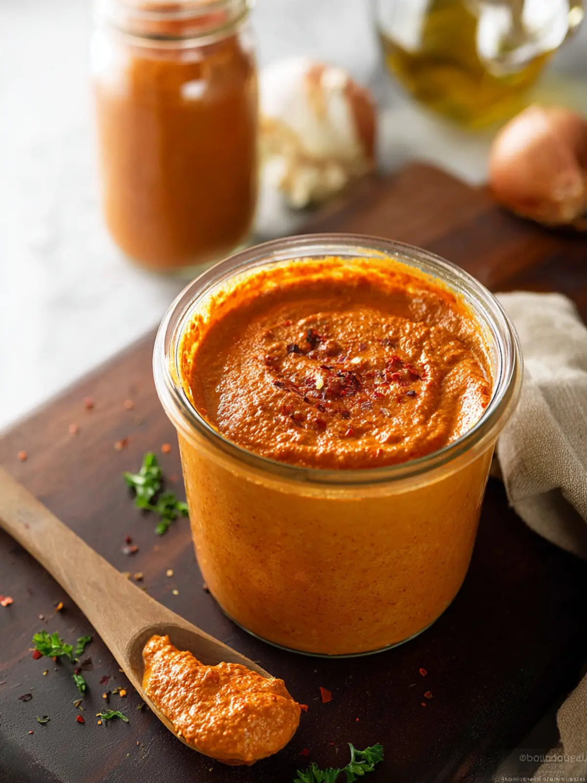 A flavorful Spanish sauce made from roasted vegetables and nuts, perfect for dipping or as a condiment.